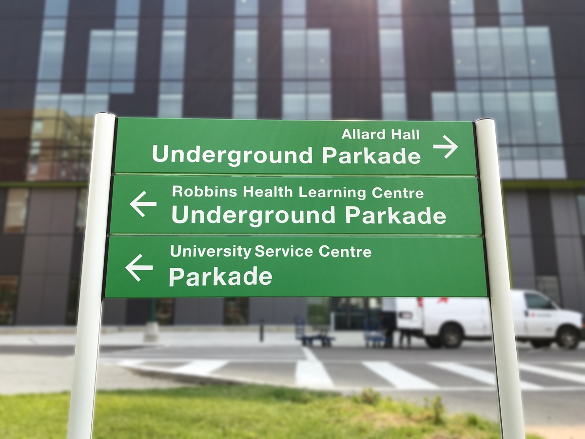 Royal Stamp was awarded the contract for fabrication and installation of all interior, exterior, parking lot, and parkade signage. Interior signage included building directories/maps, directional signs, room and classroom ID signs, workstation signs, updateable paper holders, tactile washroom and stair signs, as well as donor lettering and plaques. Exterior signage included illuminated building lettering, wayfinding signage and pylons, illuminated lettering on concrete plinths, as well signage for the parking lot and underground parkade.