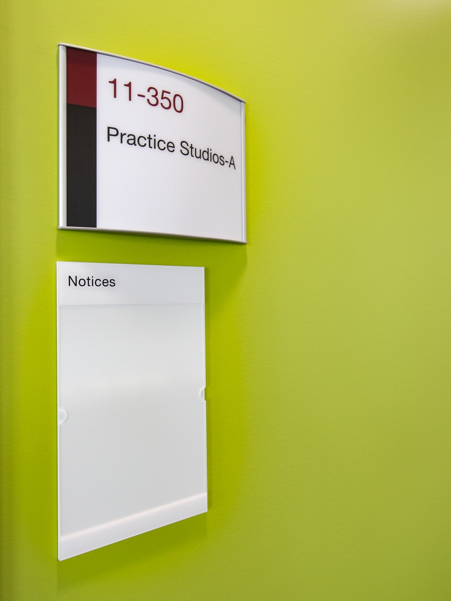 Our role involved working closely with project managers and facilities representatives to develop and implement a sign system which would be high quality, durable, attractive, cost effective, and easily updateable. Samples and prototypes were provided, followed by shop drawings, fabrication, and coordinating the installation with site trades and user groups. Engineer stamped drawings were provided for exterior signage and permit applications were submitted. Many last-minute additions were made to the initial scope of work, which needed to be in place for various media and donor events.