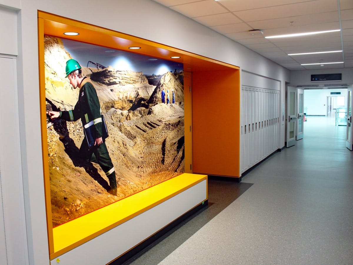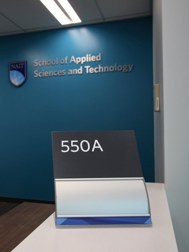 Our role involved working collaboratively with NAIT, Clark Builders, and the consultant in providing our expertise regarding product design, functionality, and suitability. Samples and prototypes were developed, followed by the creation of shop drawings, fabrication, and installation. Additions to the interior signage continued throughout the project, including signage for all of the restaurants in the food court. Site meetings were held to view installed mockups of the wall graphics and frosting film to determine the most visually appealing options, factoring in privacy requirements and light diffusion.