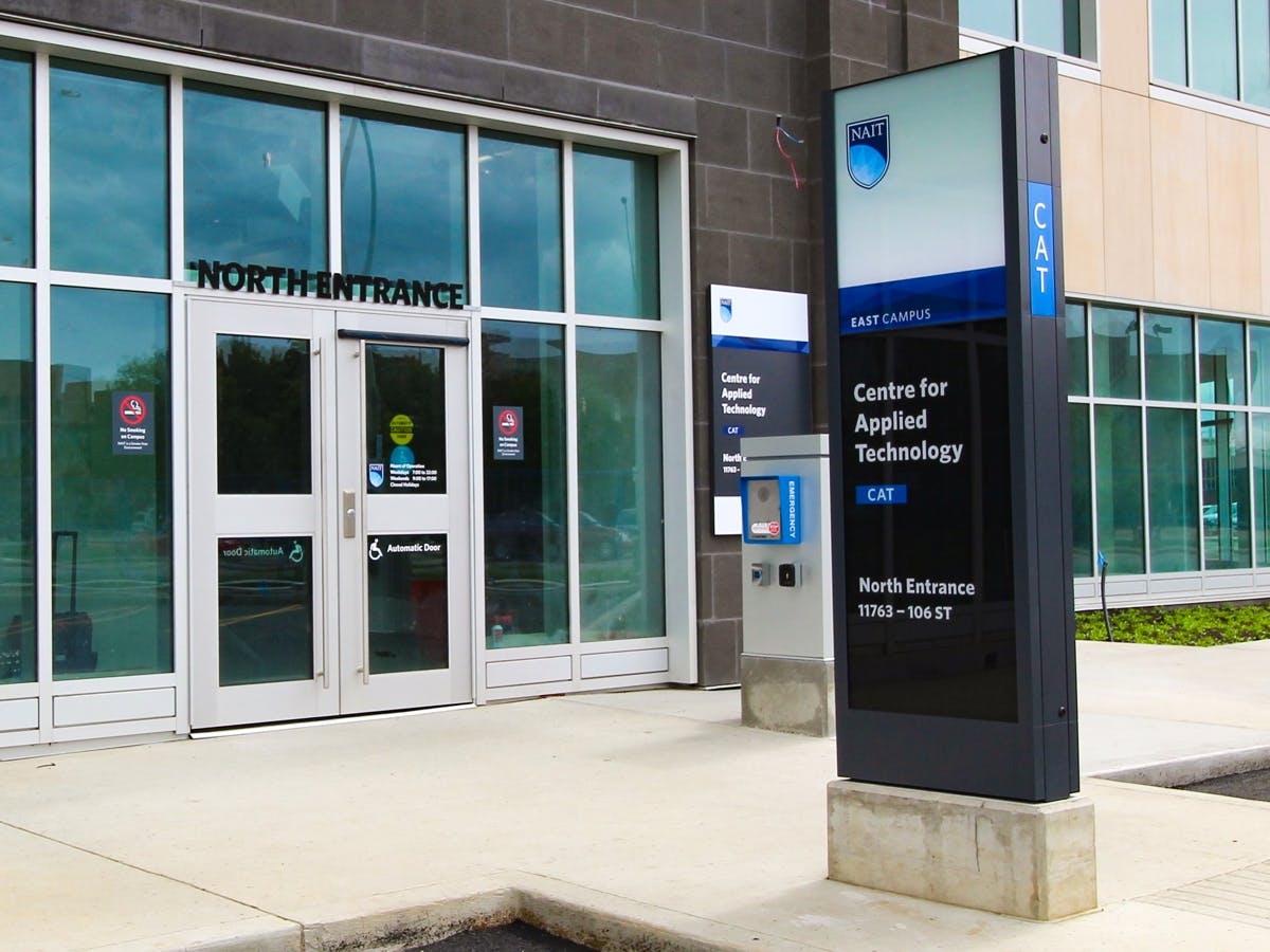 The Centre for Applied Technology (CAT) Building is a 555,000 square foot state of the art facility and is one of the largest post-secondary buildings in Canada. The five-storey building serves approximately 5000 full time students studying in advanced labs, classrooms, and simulation rooms and offers numerous amenities and services. It is now called the Feltham Centre, named for NAIT’s sixth president and CEO.